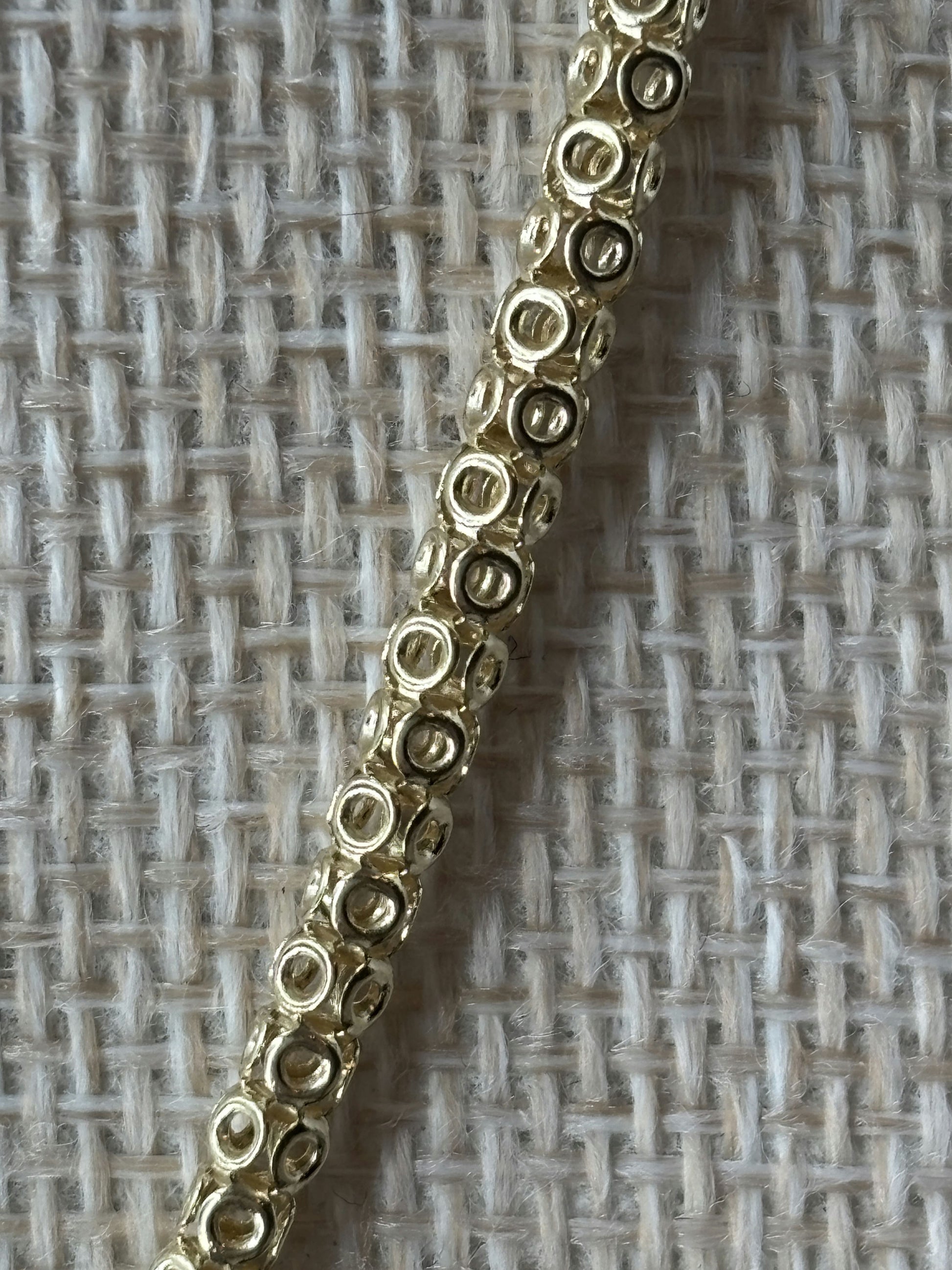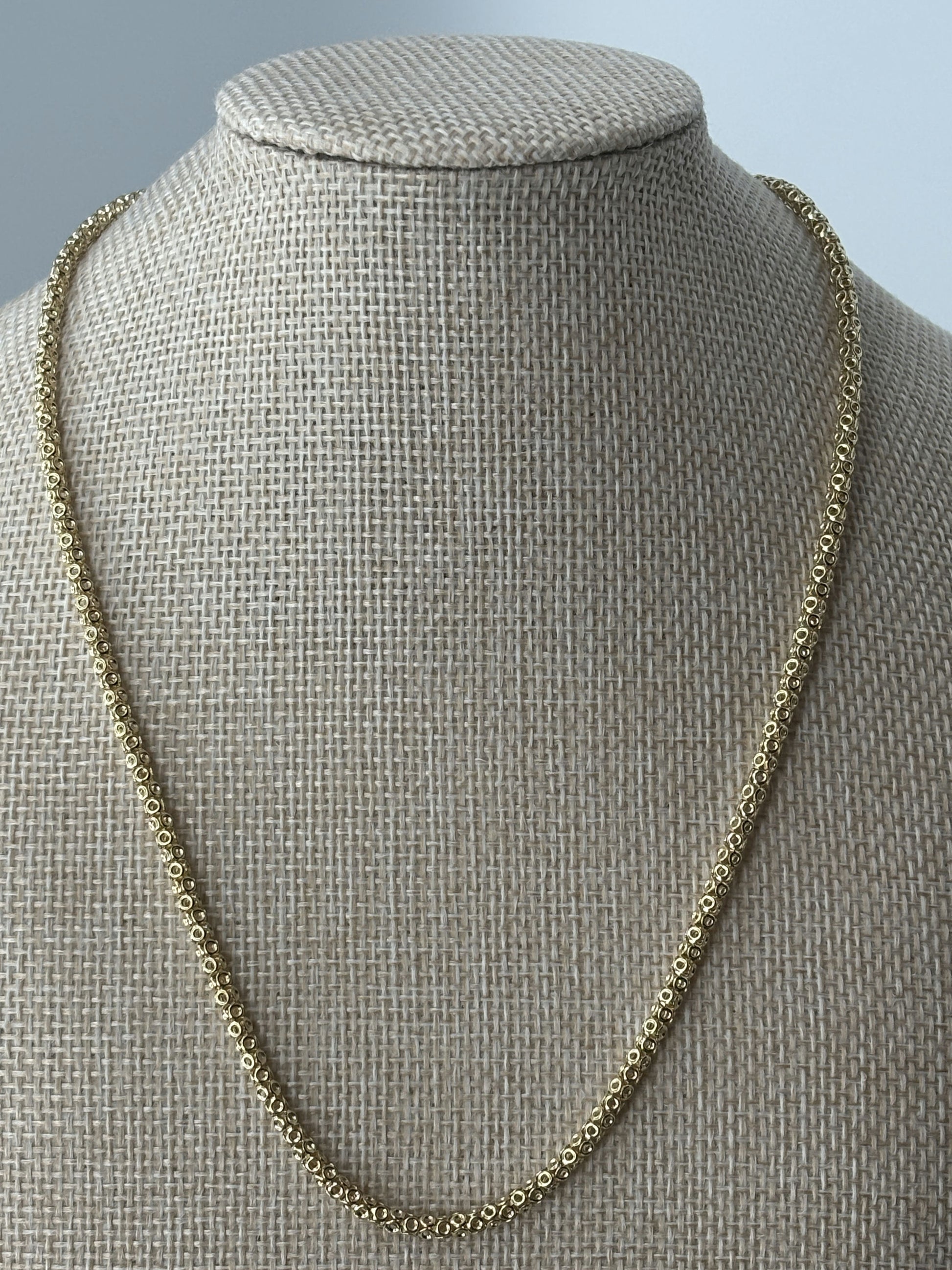 Bubble chains always seem so whimsical -- like they were made by popping bubbles in gold. This one is no different. A slightly less common link than your regular curb link or box link, this is a chain with presence. This 14k yellow gold chain measures 17.75" long and 3mm wide. Total weight 8.5g.