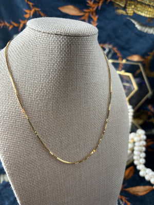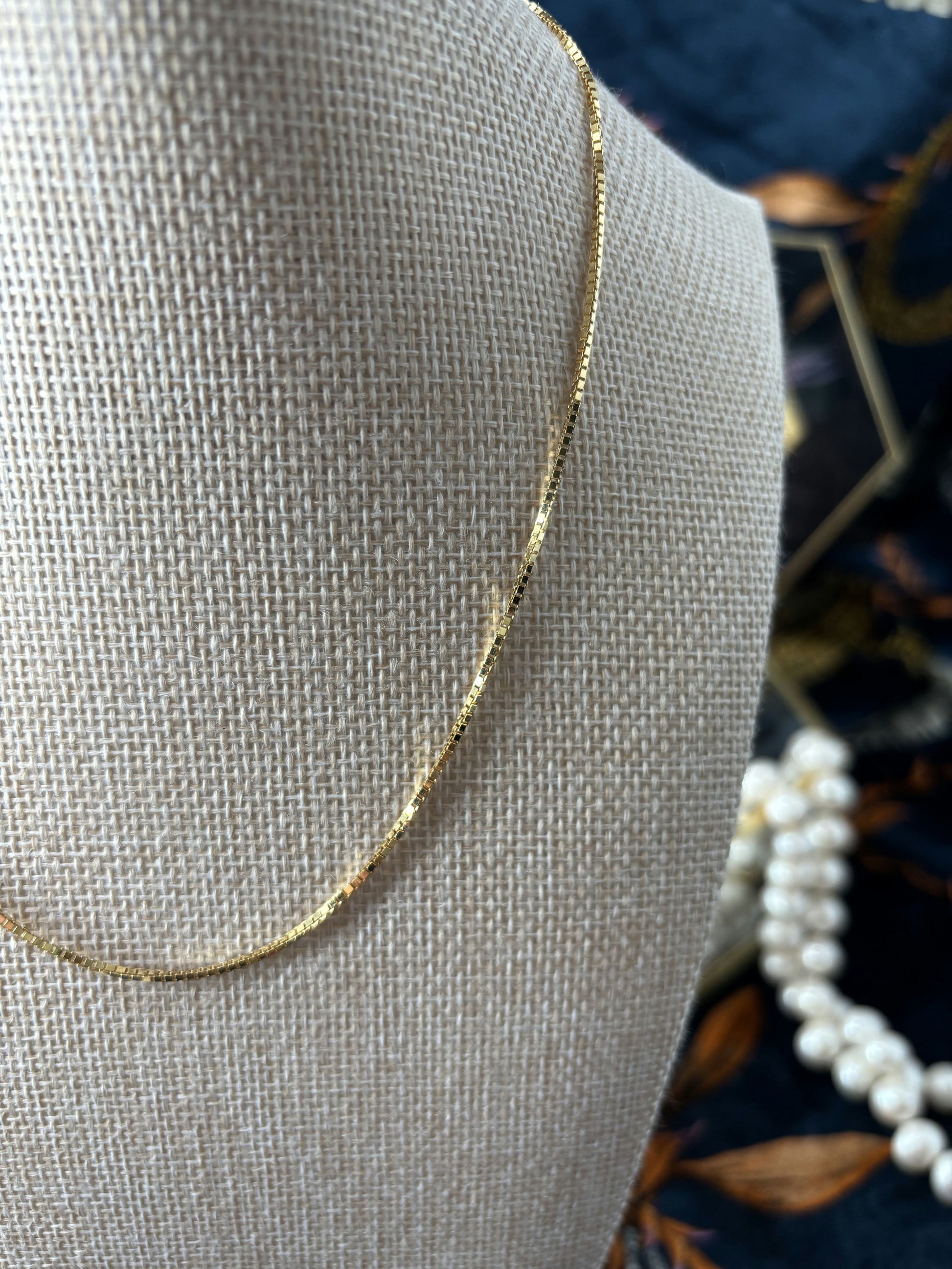 A staple for your stack. This 14k yellow gold box chain is a great piece. At 16.25" long and 1.5mm wide, she's a shorter one, but hits at a flattering place on many. Total weight 5g.