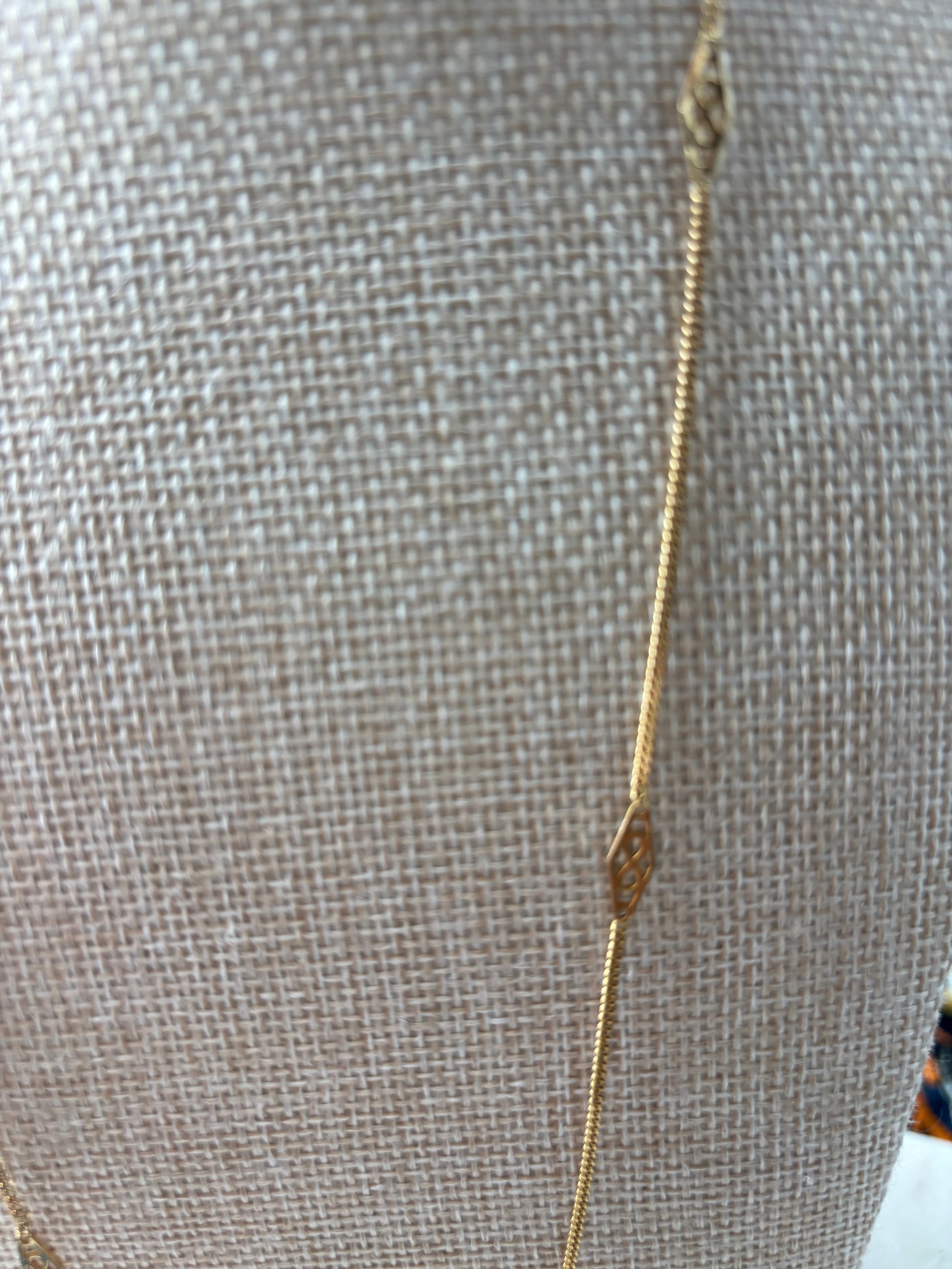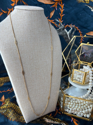 A station chain can do so much in a collection -- stand alone, add texture to a grouping -- and this one carries the message of the infinity symbol with an Italian pedigree. 14K yellow gold. 26" in length. The chain has a width of 1.4mm and the stations at their widest point (in parallel to the chain) are 4mm wide. Italian hallmarks. Weighs 5 grams. Very good vintage condition.