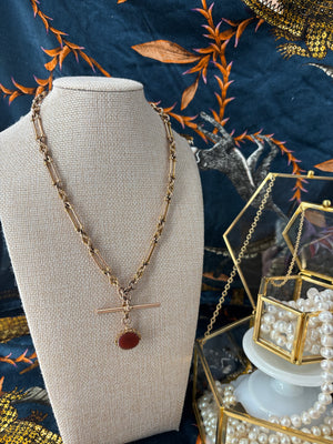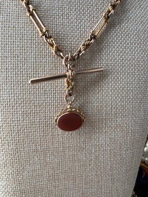 This stunner is an antique watch chain, hallmarked for 1915, with embellished trombone links and lovers' knots. The trombone links are stamped for 9K gold, as is the T-bar. The 2 dog clips are both stamped with the maker's mark: W.H.W.Ld for W.H.Wilmot Ltd, gold chain makers of the Albion St. Works in Birmingham. The spinner is dual-sided, with a carnelian and bloodstone on opposite sides, and is marked for Chester 1921. It's a very wearable chain at 17.25", is 6mm wide, and without the spinner, weighs in at just over 36 grams. Very good antique condition.