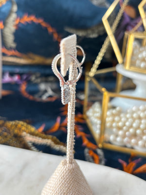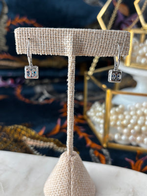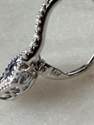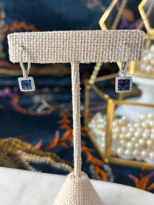 These invisible set sapphires are surrounded by glittering diamonds -- all natural stones, set in 14K white gold. From the top of the hook to the bottom of the earring measures 23mm and at the widest point 8mm. Weigh 3.0 grams total. Very good pre-owned condition.