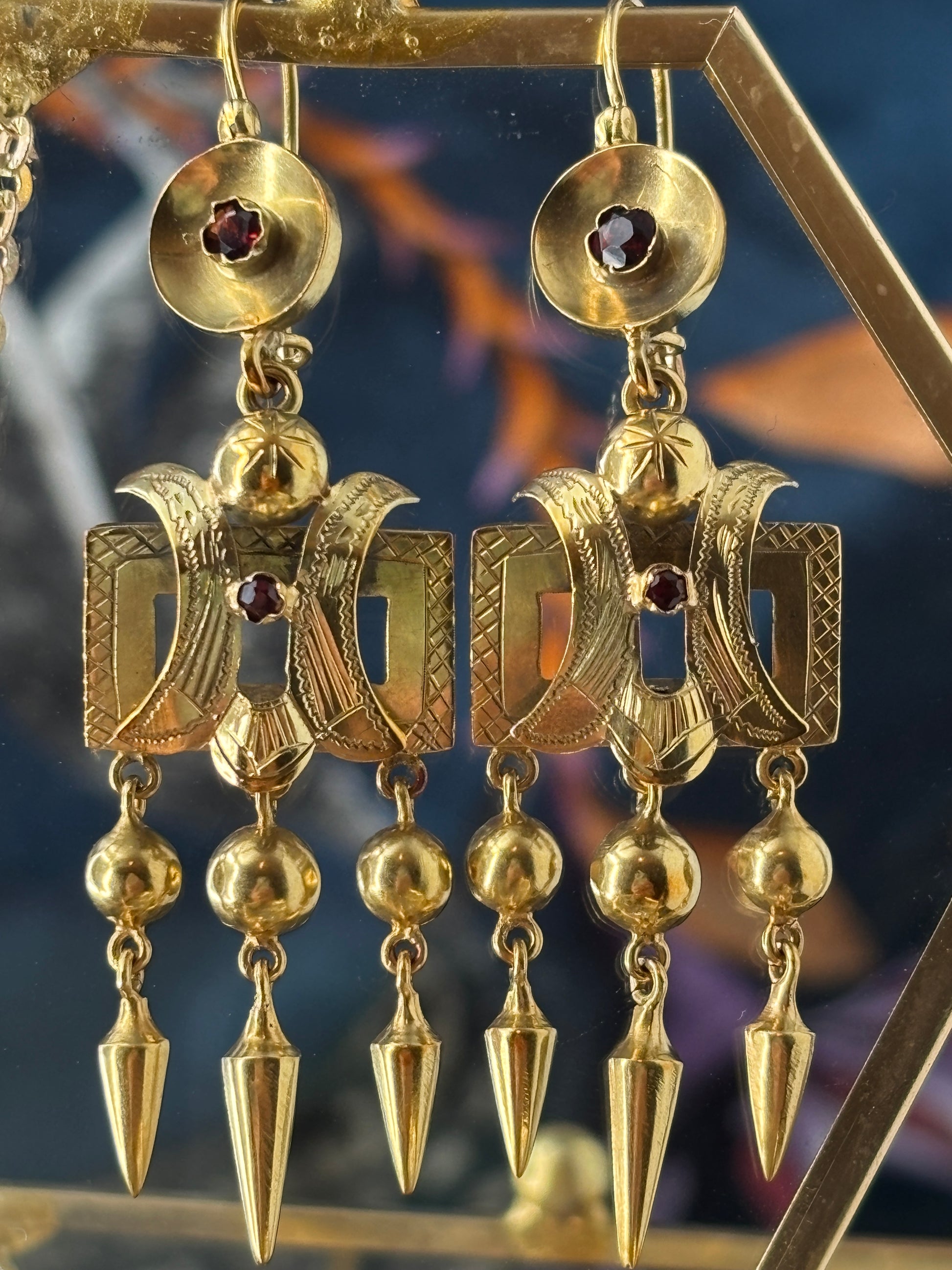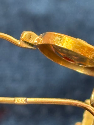 These stunning Victorian earrings are fashioned in 14K yellow gold and have a beautiful patina. Adorned with garnets typical of the time, the movement and hand engraving on these earrings is lyrical. They measure 62mm in length and 17.5mm wide. Weigh 6.6 grams together. Very good antique condition.