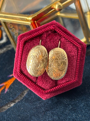 Lovely engraved discs fashioned in 14K yellow gold. Likely from the 1940s. Measuring 25mm in length and 13mm wide. Weigh 2 grams together. Very good pre-owned condition.