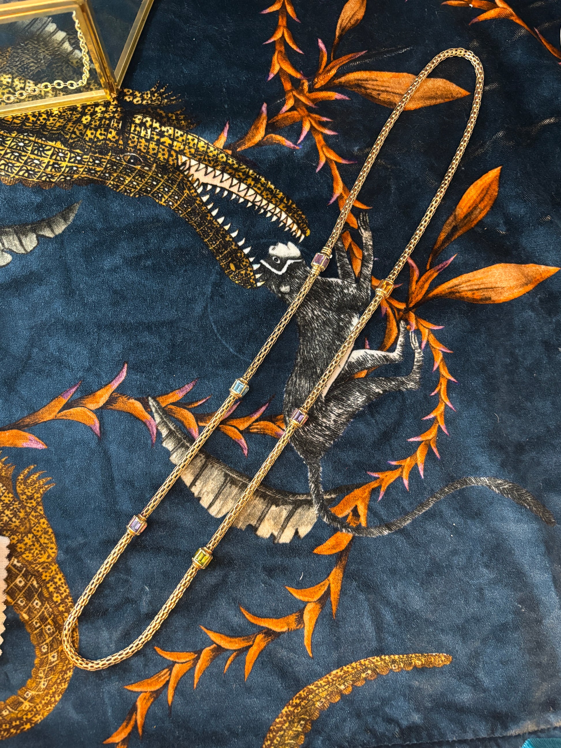 This necklace is so cool! Incredible workmanship through and through, with beautiful gem stations worked onto gorgeous 14K yellow gold. At 30.75" long, a clasp isn't required, but there is a clever hidden clasp within one of the amethyst stations. See photos for more details. The chain is 4mm wide and the gem stations at 8mm wide. Weighs 30.8 grams. Very good pre-owned condition.