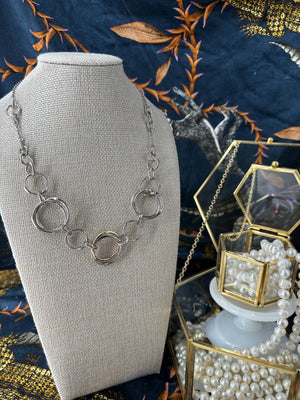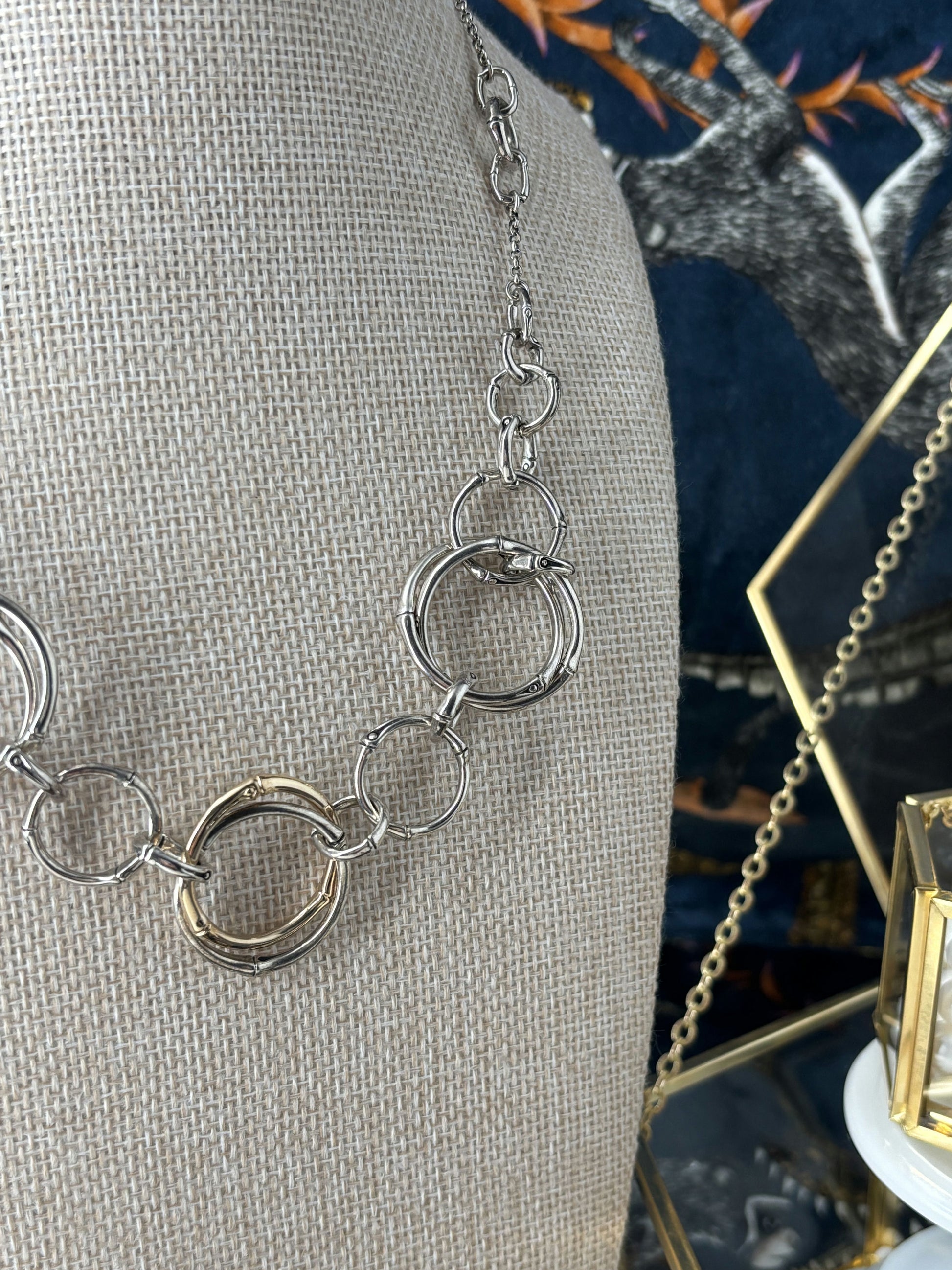 John Hardy is a mainstay in our collections because of his attention to detail and classic bamboo accents. This round bamboo link necklace has the added benefit of being two-toned, with an 18K yellow gold link at the front of the piece.