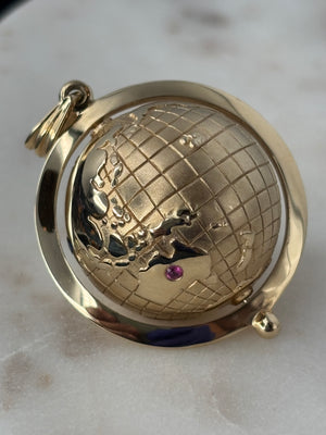 Having the whole world at your fingertips is prosaically possible with this gem-set golden globe. Carry your travels around your neck with this pendant. Measuring at 43mm tall, 30mm wide, and 21.7 grams of 14k gold. Very good pre-owned condition.