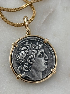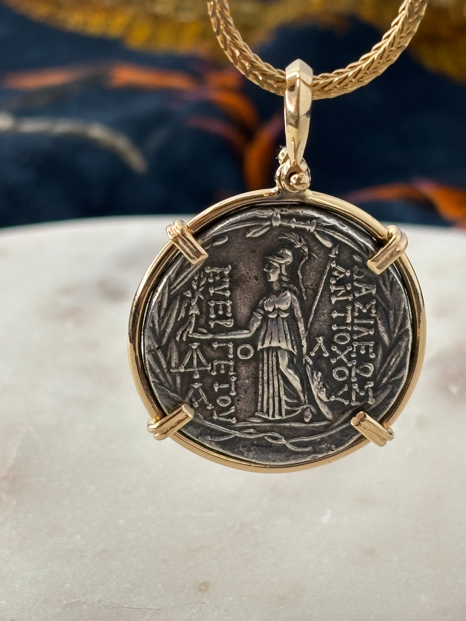 A beautiful specimen of an ancient silver coin, this Greek tetradrachm was minted circa 140-110 BC. One side depicts King Antiochus VII and the reverse depicts the goddess Athena Nikephoros. Antiochus had a 9 year reign as emperor, which ended in 129 BC. Athena Nikephorous is the bringer of victory in war and hardship. The coin is framed in 14K yellow gold and measures 45mm by 45mm. The pendant weighs 20.5 grams.