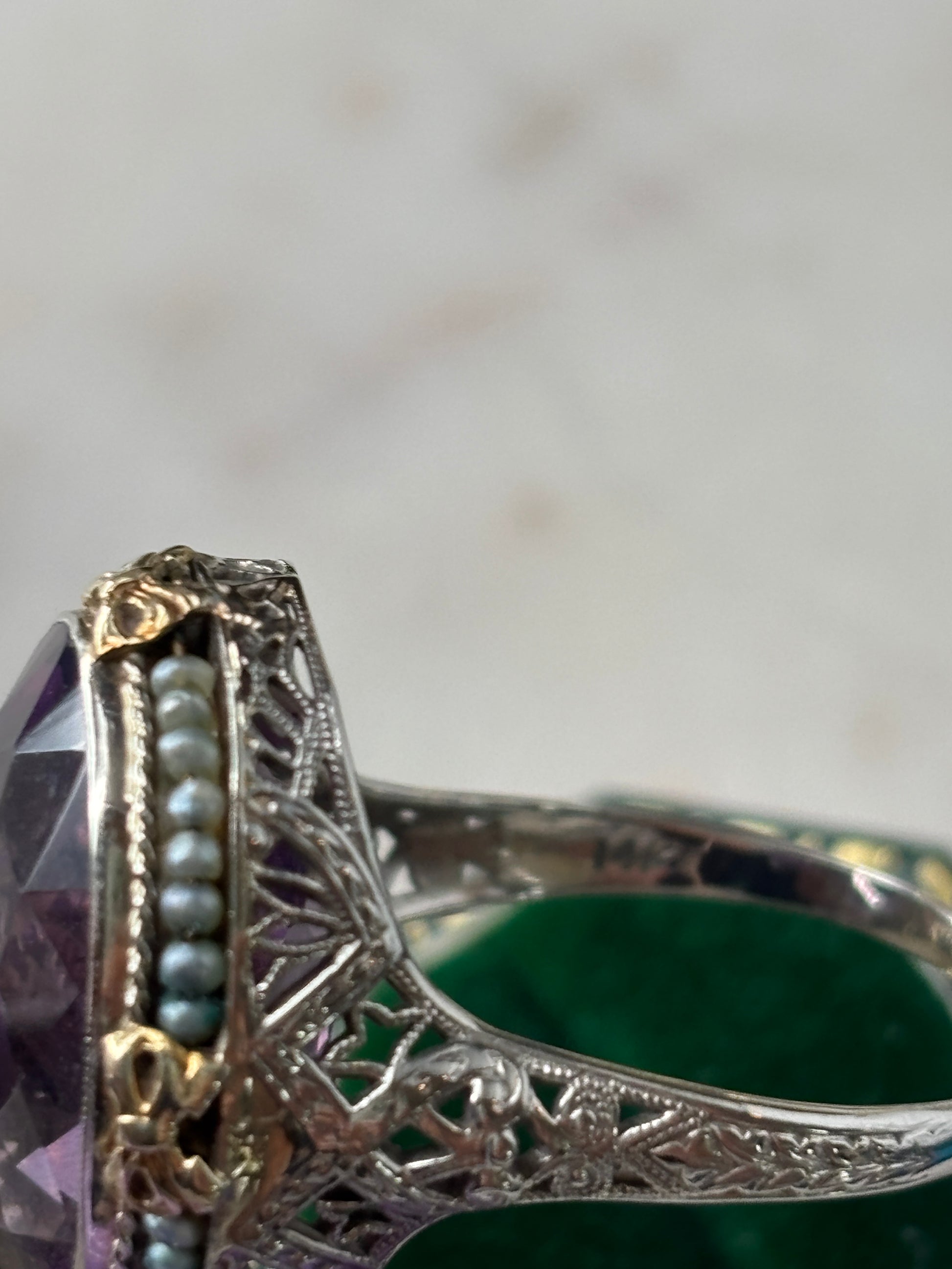 The eye-catching Art Nouveau ring has so many stunning features it's hard to know where to look first. The ring, measuring 24.45 in length and 19.8 mm in width, is marked 14K. The amethyst is a beautiful stone that plays with light beautifully and the seed pearls are a a pretty shade of blue. Weighs 8 grams. Very good antique condition.