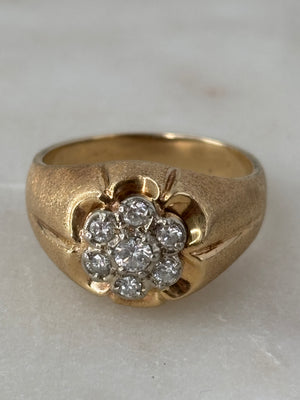 Make a visual statement with an estimated .6 tcw of diamonds set in white gold on a ring of yellow gold. The ring is 14K gold, a size 9 and sizable. The dimensions of the face of the ring are 13mm by 9mm. Weighs 8 grams. Very good vintage condition.
